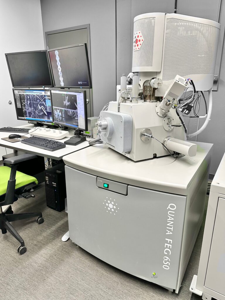 The Quanta 650 FEG is a variable pressure field emission scanning electron microscope for high-resolution imaging (SE, BSE) and X-ray microanalysis with low-vacuum capabilities for really challenging samples and dynamic experiments. It can be used for characterization, prototyping and in situ analysis of both conductive and non-conductive solid specimens at low and high temperatures. Attachments include: